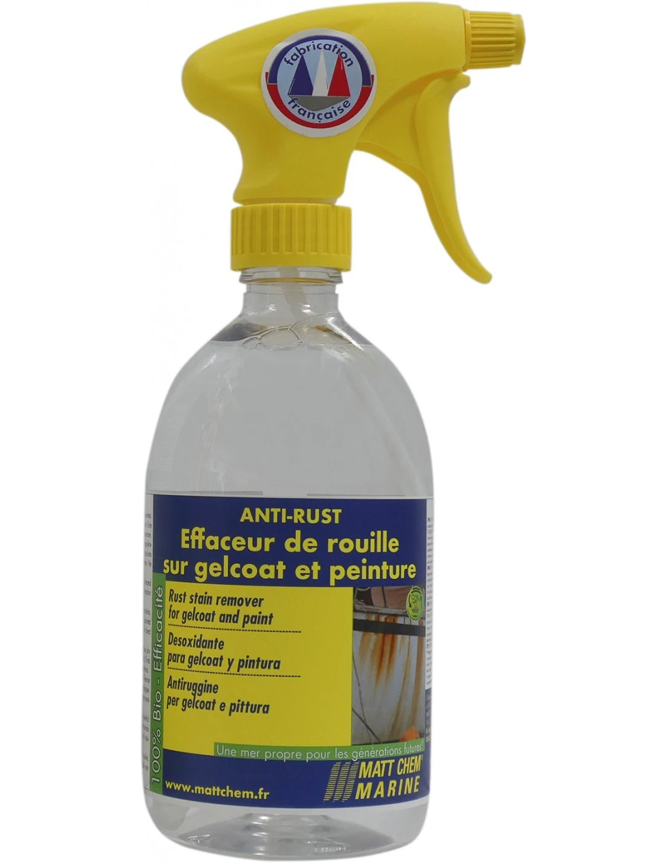 Elimina as manchas de ferrugem na fibra de vidro e superfícies pintadas. Restaura as superfícies, diminuindo riscos e irregularidades, fosfatando-as e melhorando a aderência da pintura Usar puro, pulverizar, deixar atuar durante 5 minutos e enxaguar.