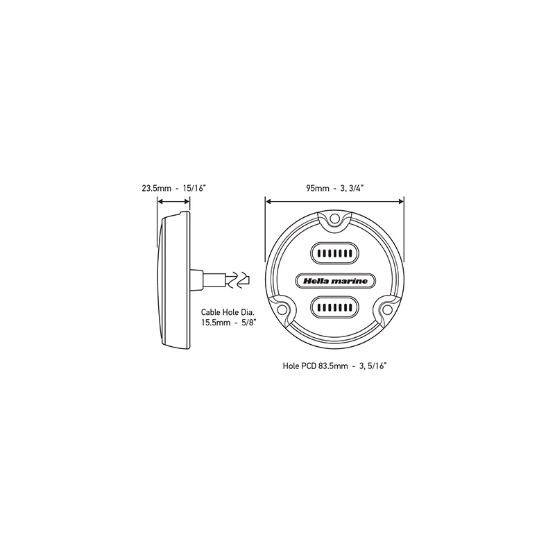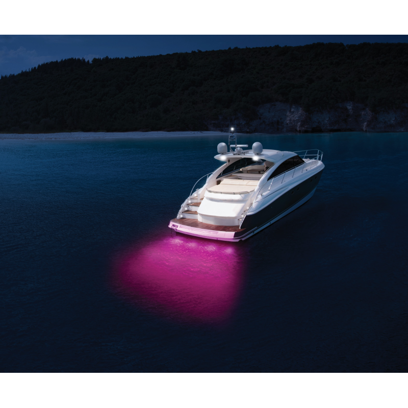 Compact and powerful underwater LED lights with marine thermopolymer body. High strength, UV resistant, impact resistant lenses in Grilamid HD offer exceptional transparency and durability with 5000K ° white light optics, 3000 lumens with 90 ° amplitude. 9-32V multivolt electronics with protection against overheating, polarity inversion and voltage peaks. Degree of protection IP68 / IP69: Suitable for immersion during operation and high pressure water jet cleaning. 15.5 mm hole for the supplied 2.5 meter electric cable.