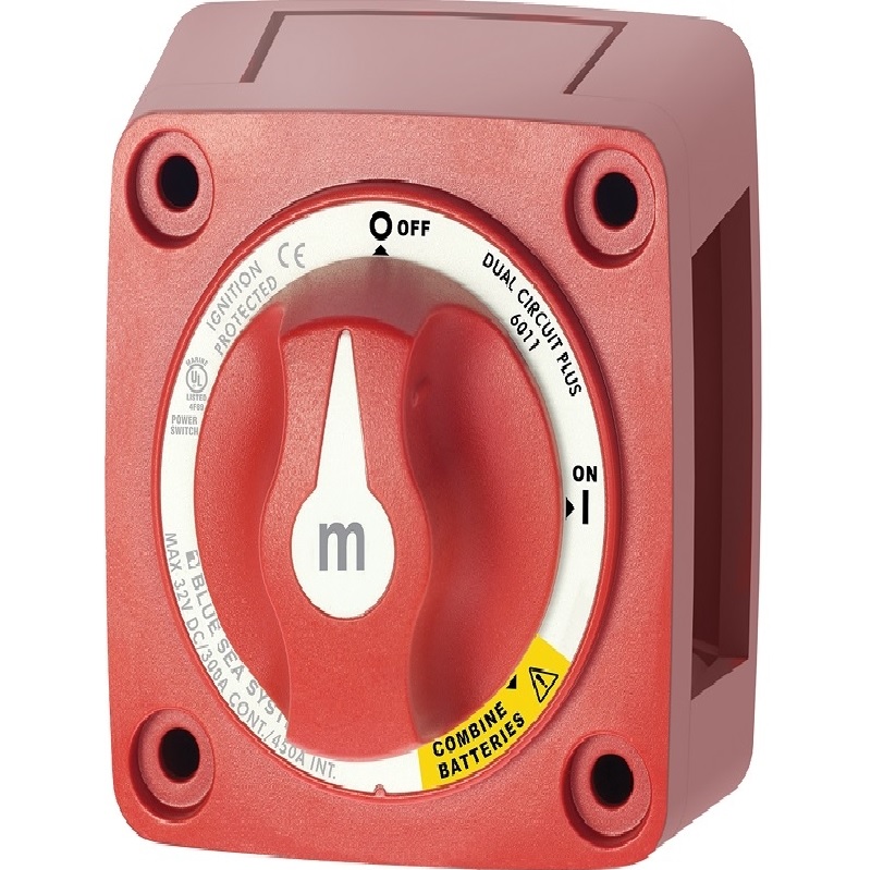 Os comutadores de baterias Dual Circuit Plus da Série-m isolam dois bancos de baterias, prevenindo a ocorrência de descarga acidental da bateria de arranque e protegendo a eletrónica a bordo de picos causados pelo arranque do motor.