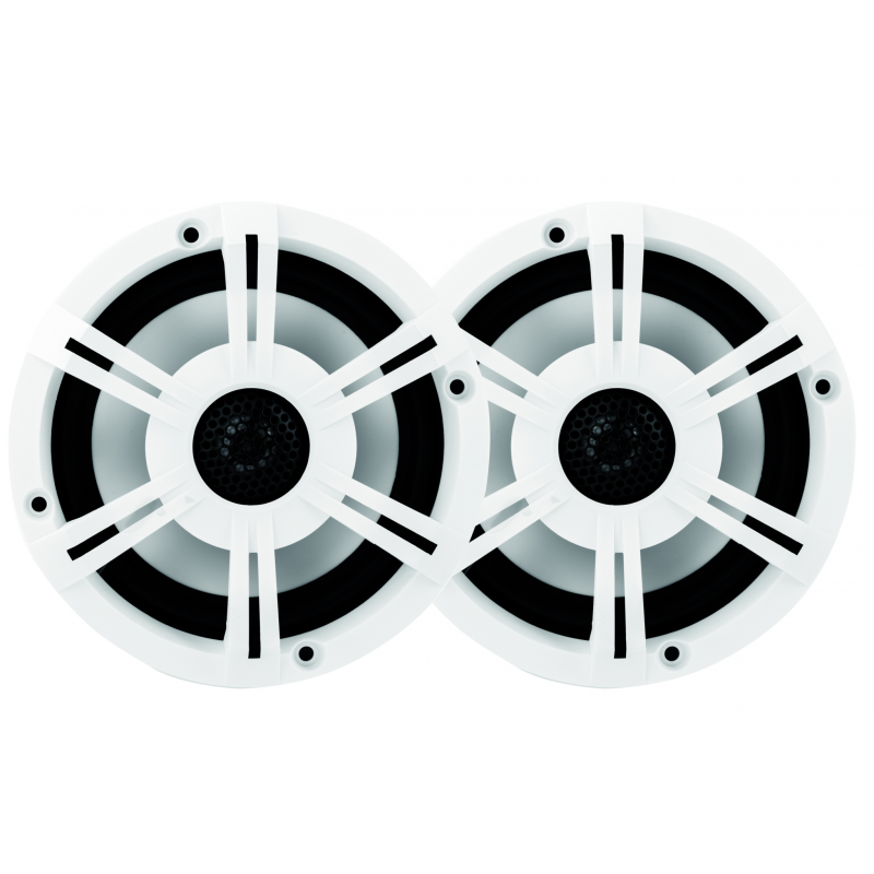 Pair of Bluetooth speakersin white anti-UV plastic, waterproof IP66. Connectable to smartphone. Bluetooth range mt 8. Power supply 12 V. Watt max 80. Impedance Ohm 4. External Ø 180 mm. Recessed Ø 132 mm. Depth 90 mm.