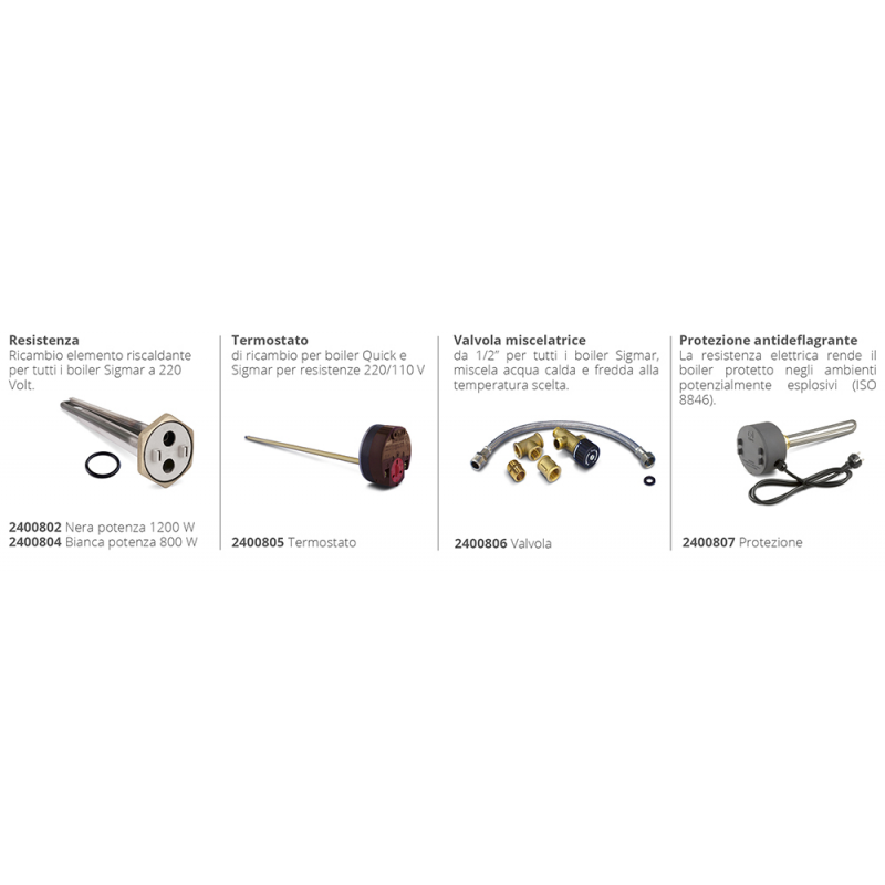 Boiler built with quality materials suitable to the marine environment which ensure high strength and durability with AISI 316 stainless steel tank thermally insulated by a highdensity polyurethane foam lining (thickness 20 mm). Mounting with stainless steel brackets. General technical features: Heat exchanger in stainless steel AISI 316. Incoloy electric heating element. 800/1200 W 220 V. Regulating thermostat with double safety. Safety and non return valve (6 bar ± 1). Engine and water fi ttings 1/2 gas. Universal mount (vertical and horizontal).
