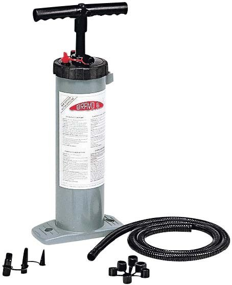 Bomba manual tipo pistão. Indicada para encher defensas e embarcações pneumáticas. Todos os componentes são fabricados em plástico sem risco de corrosão, baixa manutenção. Vem completa com mangueira e adaptadores.