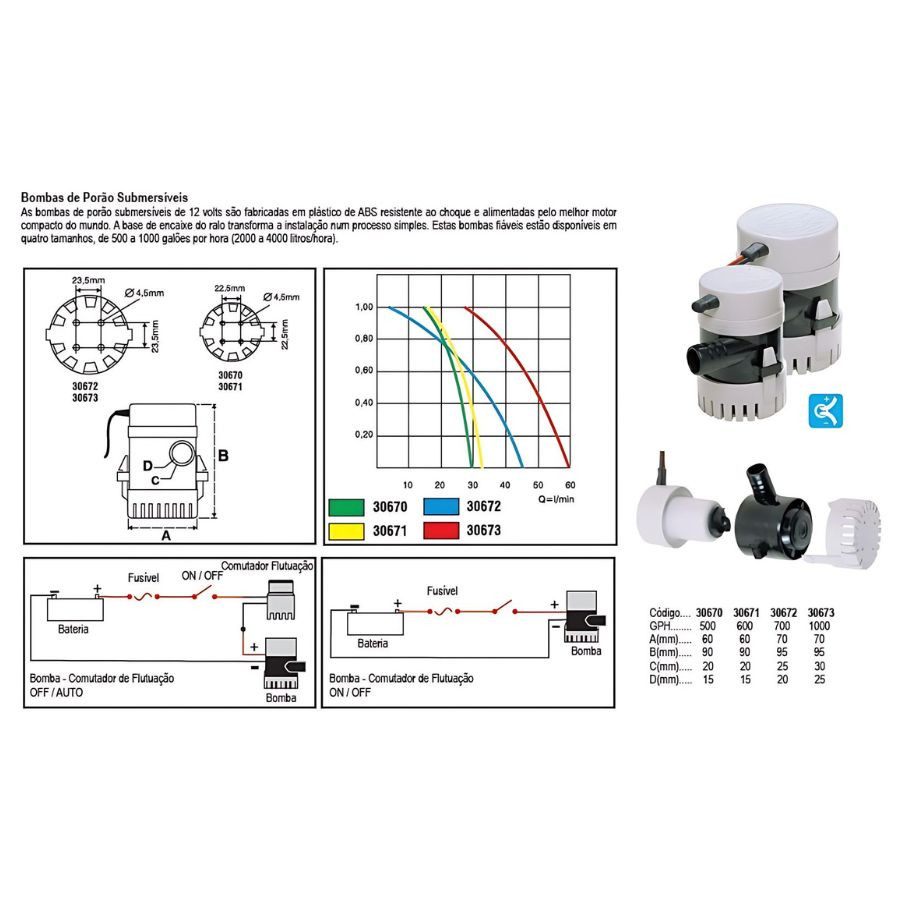 As bombas de porão submersíveis de 12 volts são fabricadas em plástico de ABS resistente ao choque e alimentadas pelo melhor motor compacto do mundo. A base de encaixe do ralo transforma a instalação num processo simples. Estas bombas fiáveis estão disponíveis em quatro tamanhos, de 500 a 1000 galões por hora (2000 a 4000 litros/hora).