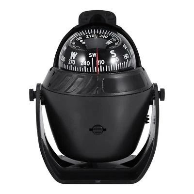 Bússola iluminada com fio para iluminação vermelha de 12 volts. Linha de lubrificação visível com suporte de montagem ajustável. Visor de sol ajustável Marcadores equilibrados individualmente para precisão.