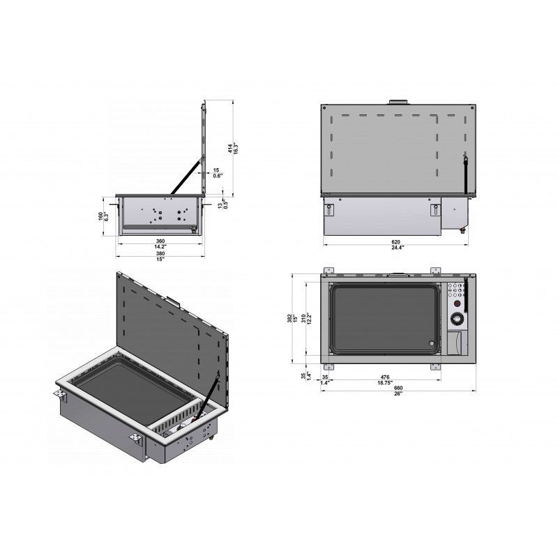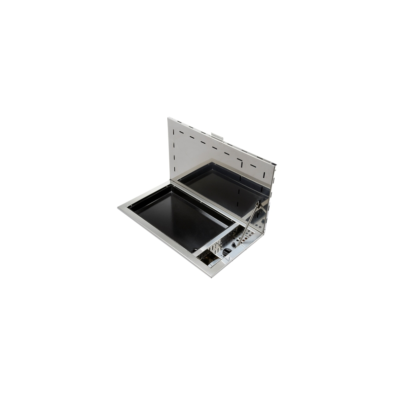 Barbeque built in made in stainless steel with enamelled cast iron plate, extra-flat lid and grease trap. Gas ignition, with safety thermocouple.