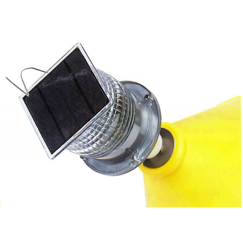 Blown polyethylene buoy with stainless steel rod and swivel, filled with closed cell polyurethane. Signaling with white light with intermittent high-visibility LED with twilight-activated solar panel. With-out certification