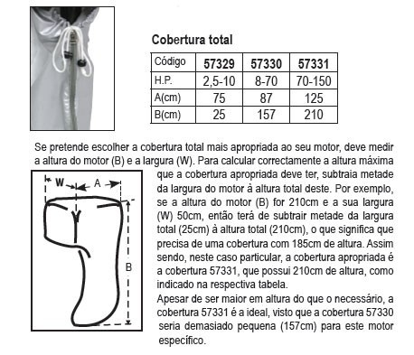 Se pretende escolher a cobertura total mais apropriada ao seu motor, deve medir a altura do motor (B) e a largura (W). Para calcular correctamente a altura máxima que a cobertura apropriada deve ter, subtraia metade da largura do motor à altura total deste. Por exemplo, se a altura do motor (B) for 210cm e a sua largura (W) 50cm, então terá de subtrair metade da largura total (25cm) à altura total (210cm), o que significa que precisa de uma cobertura com 185cm de altura. Assim sendo, neste caso particular, a cobertura apropriada é a cobertura 57331, que possui 210cm de altura, como indicado na respectiva tabela.