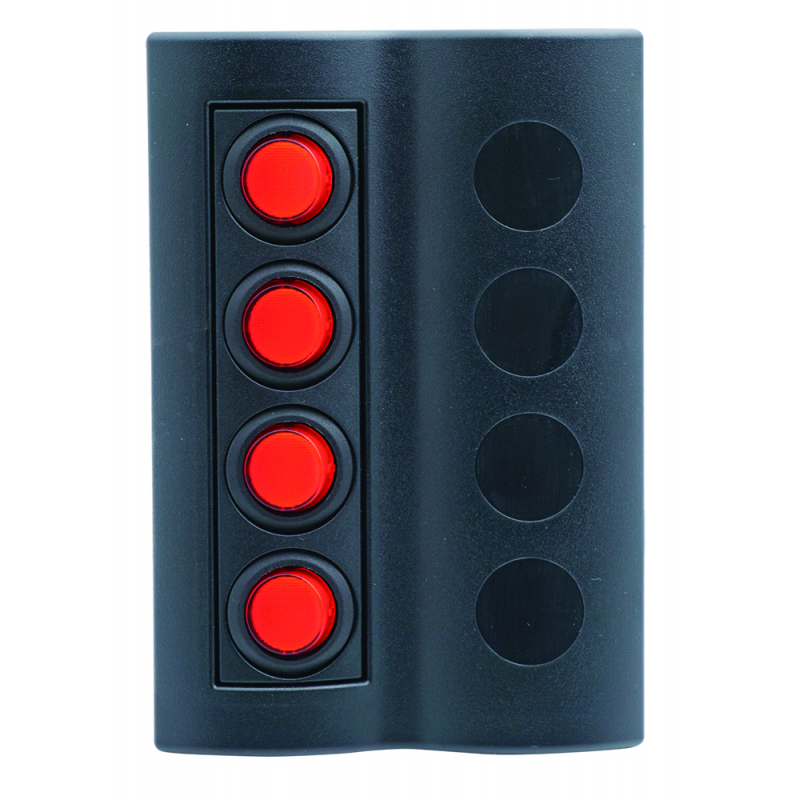 Electric panel in black plastic with tilt switches, LED light to indicate the active line and overload protection magnetothermal. 12 vdc power supply.