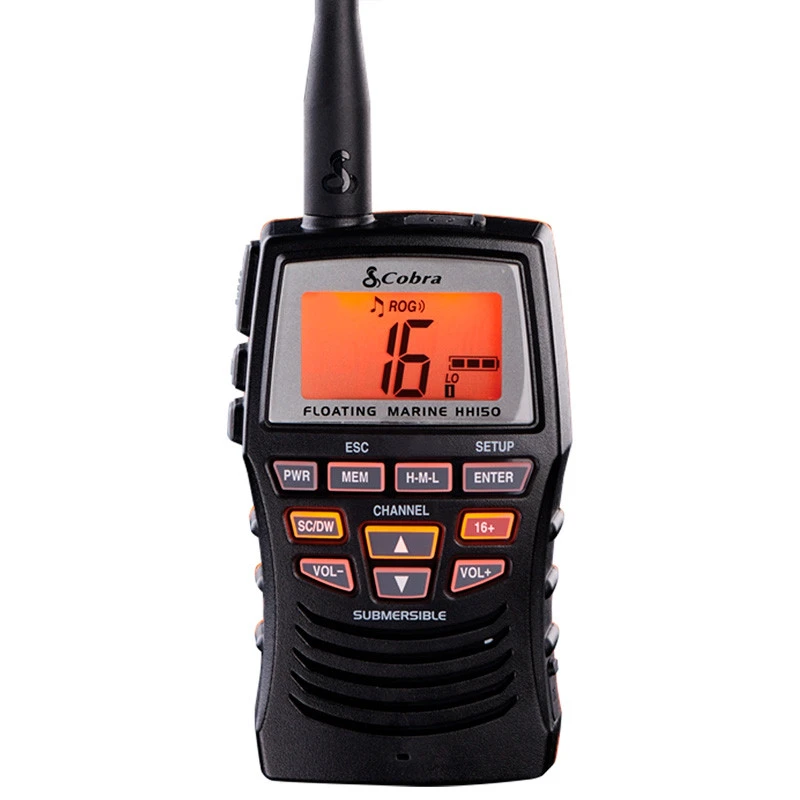 Rádio flutuante portátil, projetado para melhorar a experiência na água para todos os tipos de desportos aquáticos, o HH150 possui uma interface amigável, amplo display e recursos flutuantes como indicadores da força do sinal TX/RX, status da bateria, procura, DW canal de condições atmosféricas para mantê-lo seguro. O MR HH150 utiliza pilhas AAA recarregáveis (incluídas) com a opção de pilhas AAA normais para adicionar em caso de ficar sem energia, especialmente em emergência. Além disso, o alcance máximo e o baixo consumo de energia por um tempo operacional prolongado proporcionam aos utilizadores fiabilidade incomparável. É conveniente. É construído com qualidade. Flutua. É um Cobra