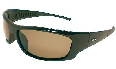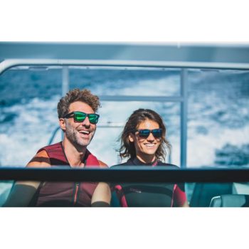 Armação grande com lentes polarizadas cinza e almofadas de borracha na ponte e nas extremidades das hastes.