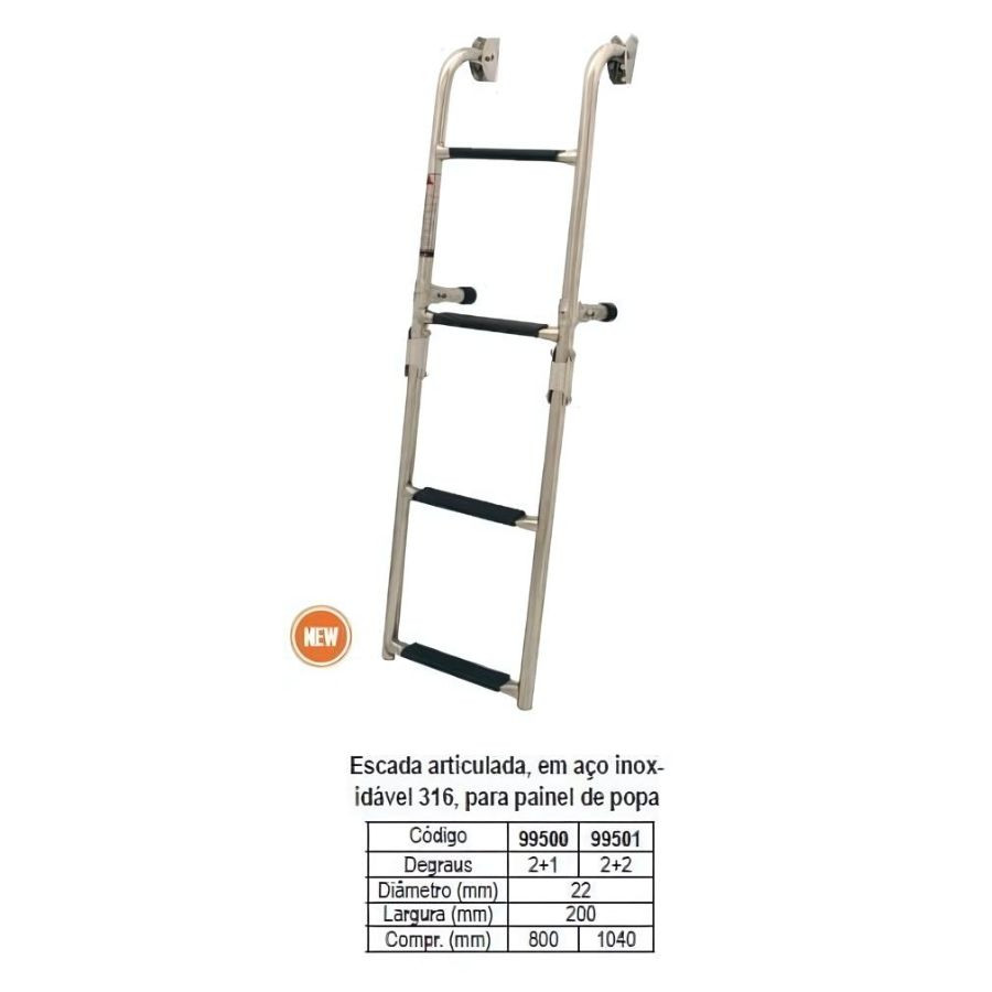 Escada articulada p/ painel de popa em aço inox 316, 2+1 degraus, 200x800mm