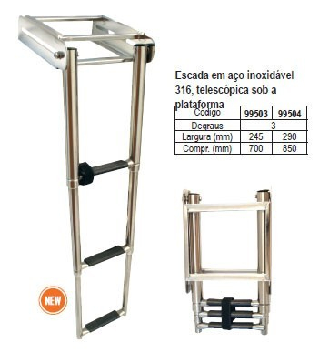 Escada telescópica sob a plataforma em aço inox 316, 3 degraus, 290x 850mm