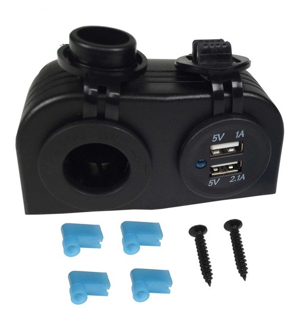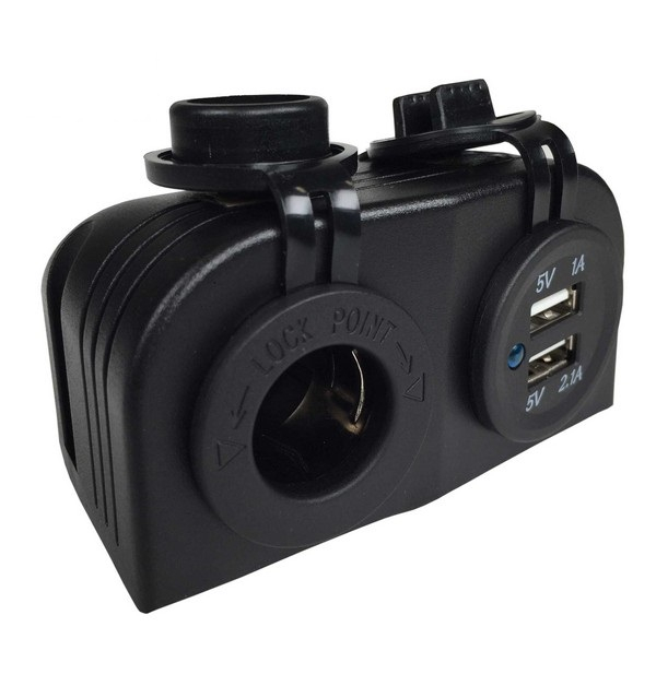 Tomada preta com ficha para tomada de isqueiro e com duas entradas USB, a entrada para isqueiro e a entrada USB dupla vem com uma tampa protetora de borracha preta.
