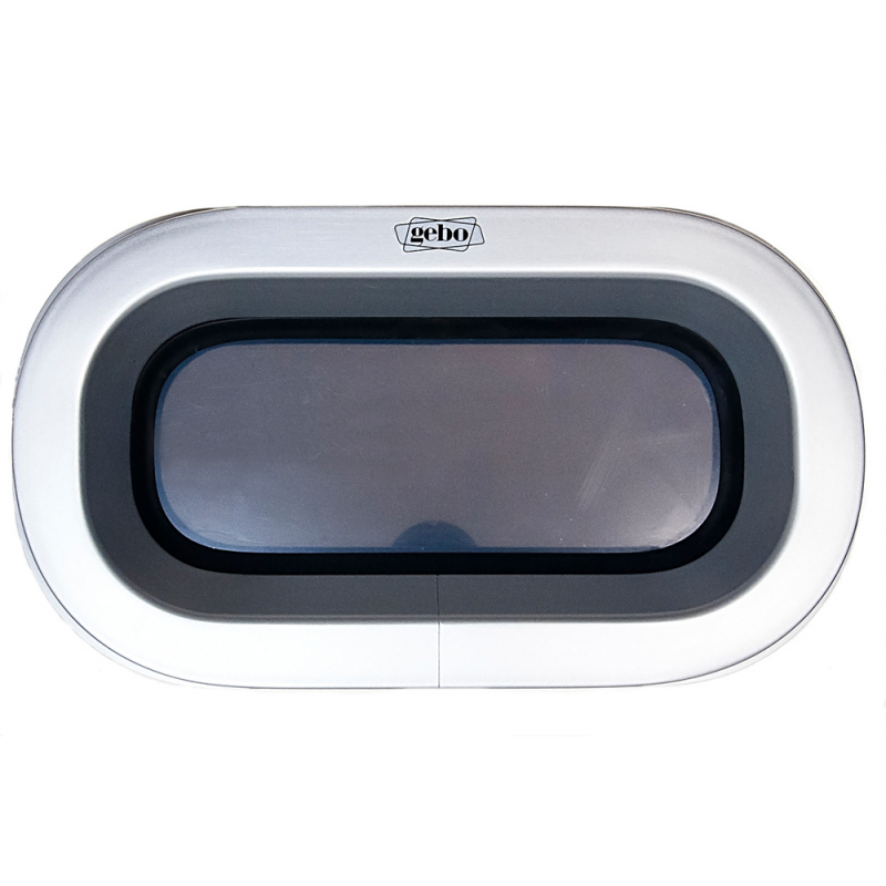 Anodized light alloy porthlight, rectangular model, rounded edges, smoky gray acrylic polycarbonate, thickness mm. 10, radius mm. 56, simple installation, requires no drilling thanks to the patented clamp system. Suitable for bulkheads from 9 to 21 mm thick. Frictional hinges make the door self-supporting. The particular edge avoids the stagnation of water.