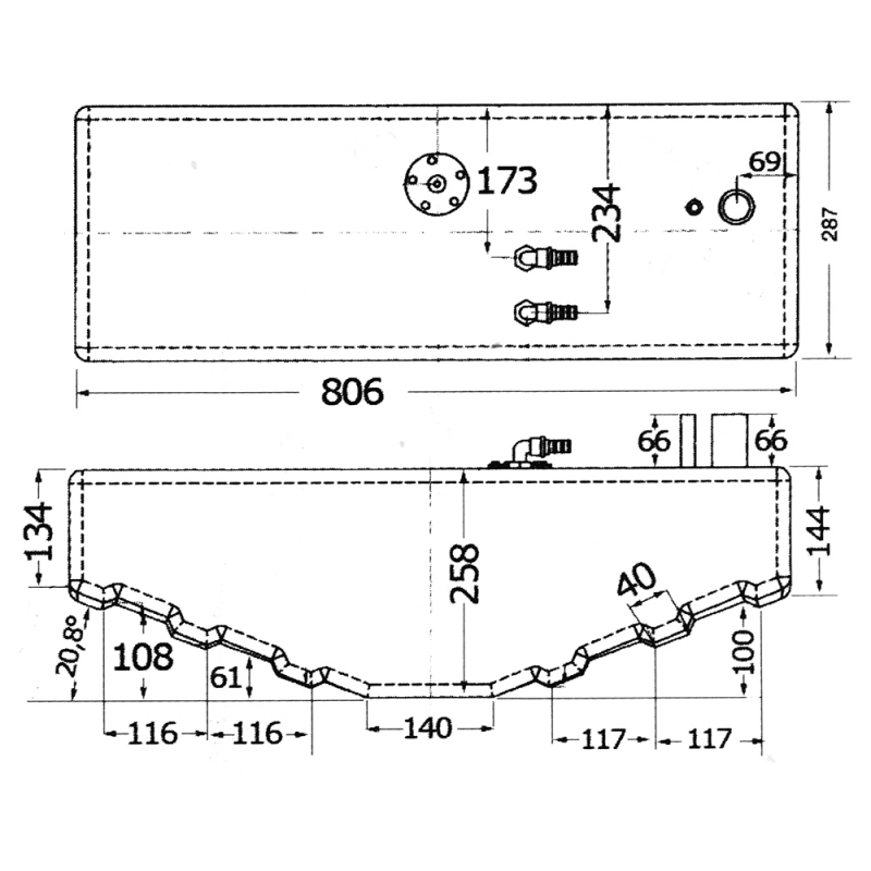 Rigid fuel tanksmade of polyethylene, are CE certified in accordance with Directive 94/25/EC according to 10088. They form hull inverted trapezoidal cross sectionthat follows the profile of the hull in order to maximize the space bilge. inserts for boarding, vent Ø mm. 16, float and return Ø mm 12. Each tank is individually tested. Color-neutral.