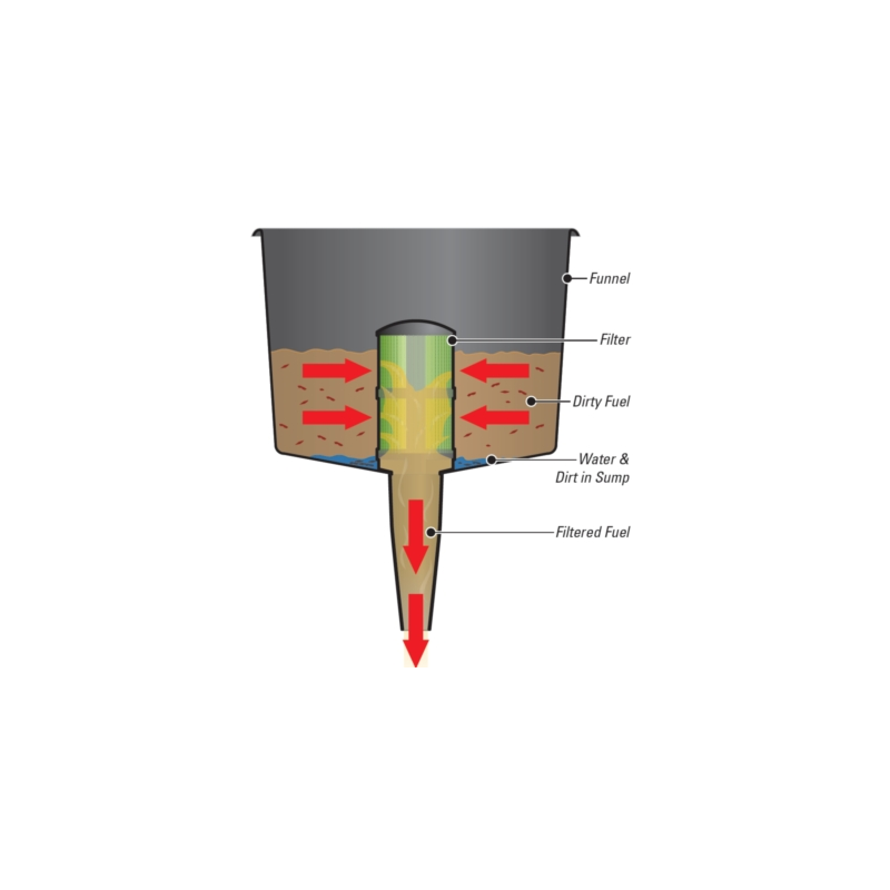 Funnel with integrated filter designed to filter water, dirt and debris from most fuels (including gasoline, diesel, heating oil and kerosene).The model is conductive and can be grounded.