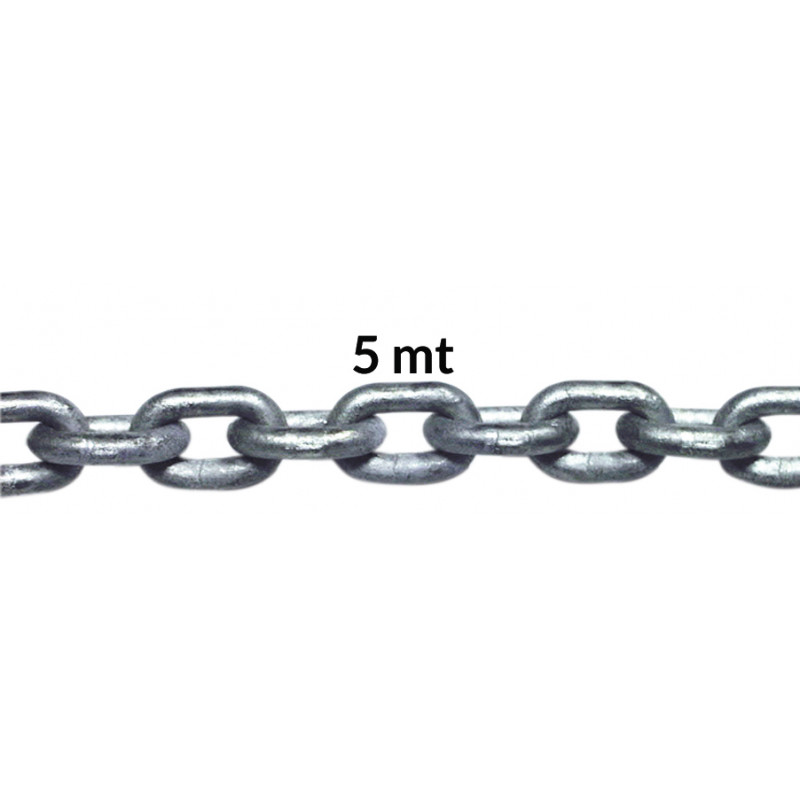 Galvanized steel long link chain DIN 5685, overall dimensions mm. Ø 8, weight Kg/mt. 1,360 breaking load 3000 Kg. Pack 5 mt.