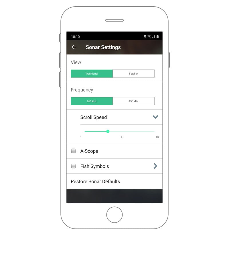 Selecione entre o modo de localizador/flasher de pesca no gelo e o modo de sonda 2D tradicional fácil de interpretar, com ajustes de definições de ganho, alcance e muito mais.
