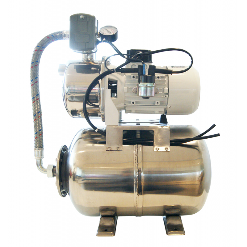 Heavy duty Water pressure system for several taps on large boats. Stainless steel body, shaft and accumulator tank of 20 l. Capacity 40 l/min. Max working pressure 2 bar. Tank set at 1,2 bar. Hose connection 1” gas. It is important to put a check valve in the inlet