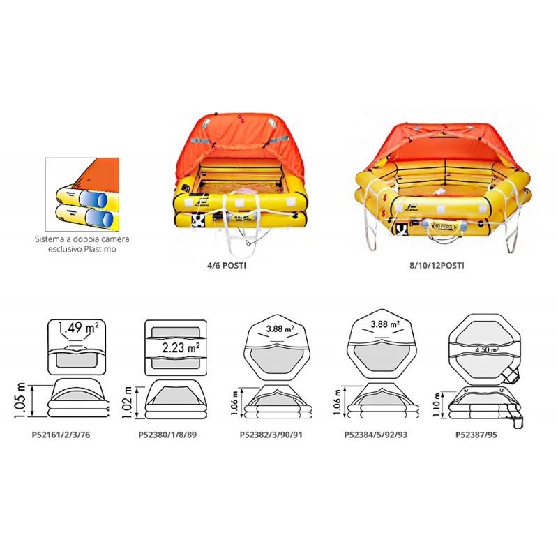 Designed for navigation in extreme conditions, ISO9650-1 certified and cataloged in class A (activation at -15 ° C) is built with double insulation floor with automatic opening arch and external light 4.3 cd. It is equipped with large containment pockets for safety and survival equipment, a large floating anchor and a ballasted reversible ladder that allows easy and comfortable ascent from the sea. There are two types of survival equipment available depending on the expected time that the victim can spend in the raft waiting for the rescue: the standard one, without drinking water and food, if the rescue forces are expected within 24 hours of stay at sea, the one emergency, which also includes water and food, if the rescue forces are expected beyond 24 hours at sea.