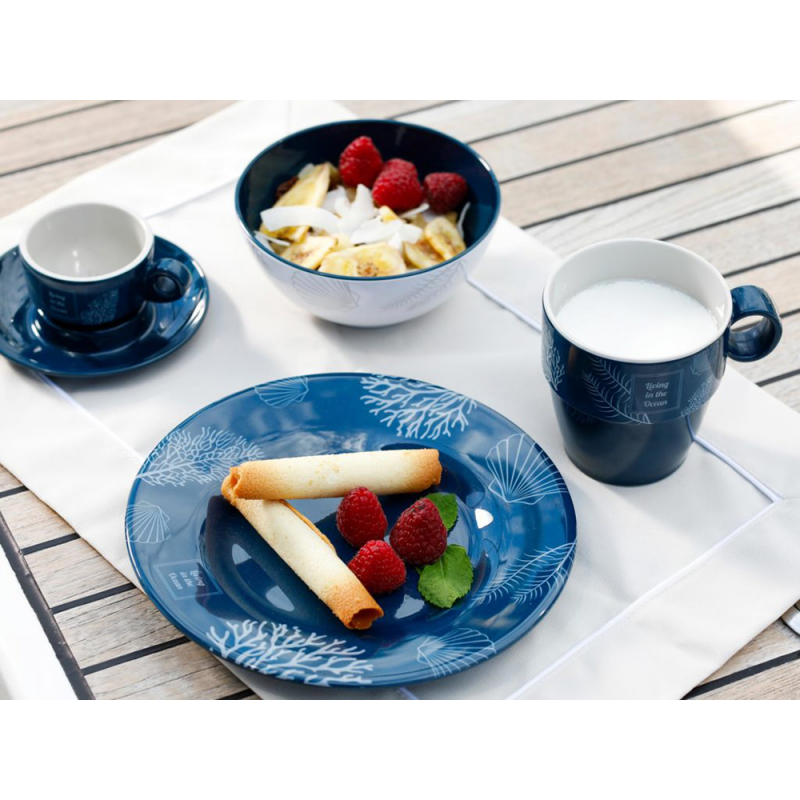 Tableware made of 100% Melamine, PBA Free. In shades of navy blue and beige, decorated with coral and shell designs. Dishwasher-safe. The crockery, cups and glasses have a non-slip ring at the base that prevents them from slipping on the table.