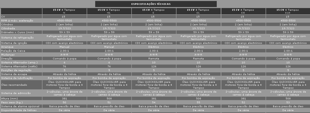 O 15 hp a 4 Tempos é um motor com concepção de uma só árvore de cames à cabeça, o que significa que tem menos componentes móveis e oferece características incomparáveis de funcionamento suave, silencioso, potente e sem problemas.