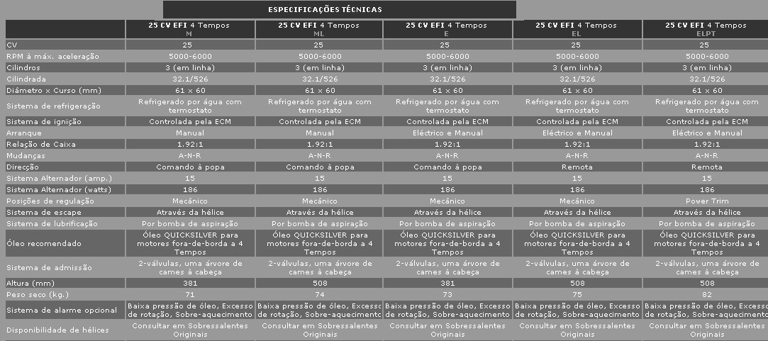 A Mercury é a primeira a incorporar o sistema EFI num 25 hp e a primeira a oferecer o 25 e 30 hp de arranque manual com um sistema EFI que dispensa bateria. O EFI é o ícone em potência com baixas emissões de fumo, com arranque instantâneo, gestão ultra-eficaz do combustível, e funcionamento suave em qualquer condição atmosférica.