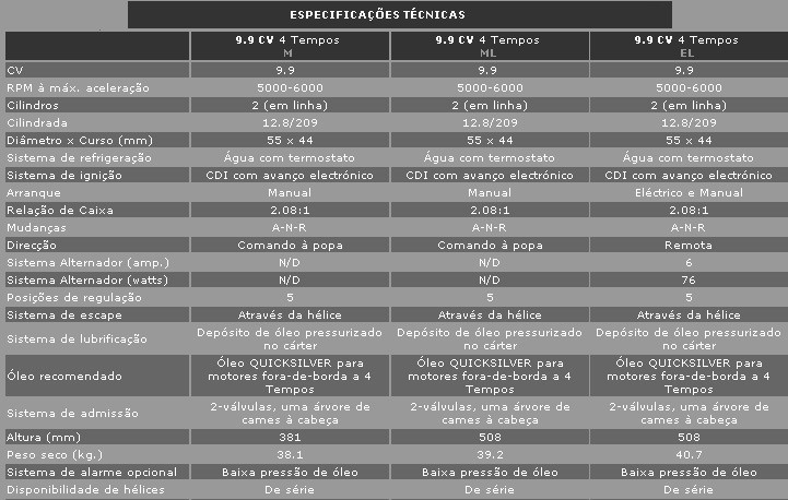 Mercury definiu a categoria de performance em motores a 4 Tempos. Com os 8 e 9,9 a Mercury chegou ainda mais longe. Estes novos motores a 4 Tempos proporcionam potência, com a maior eficácia do combustível e a suavidade possíveis, sem o problema do peso. Com apenas 38,1 kg são suficientemente leves para serem realmente portáteis.