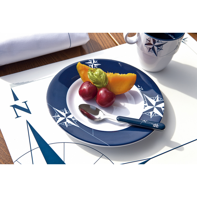 Tableware made of 100% melamine. In shades of navy blue and white. Dishwasher-safe. The crockery, cups and glasses have a non-slip ring at the base that prevents them from slipping on the table.