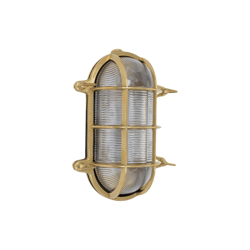 Polished brass indoor or outdoor light. With two fixing holes, transparent glass