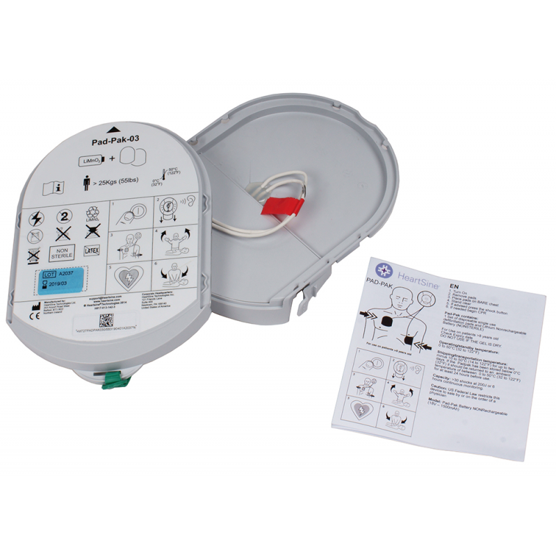 Pad-Pak 03 for adults complete with battery and electrodes. Dimensions mm.100x133x24, weight 200 gr