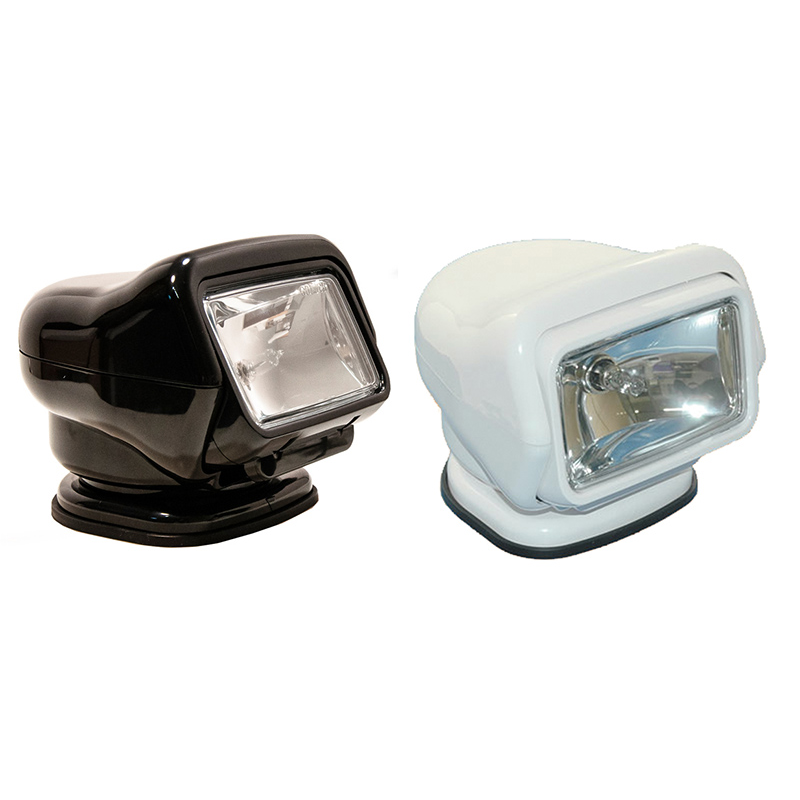 Radio Remote controlled Golight Stryker searchlight, built in white plastic material. Seawater and UV rays resistant. Tight. 370° going turning. Vertical adjustment of 135°. Special patented sealed beam Cr5 Pentabeam II Technology, Bulb Philip 9011. 200.000 candles. Power 65 W. Consumption5,5 Amp. Voltage 12 V. Supplied with tight radio control for remote control (max 15 m.). Dims. 180x190x175 mm. Base 152×152 mm.