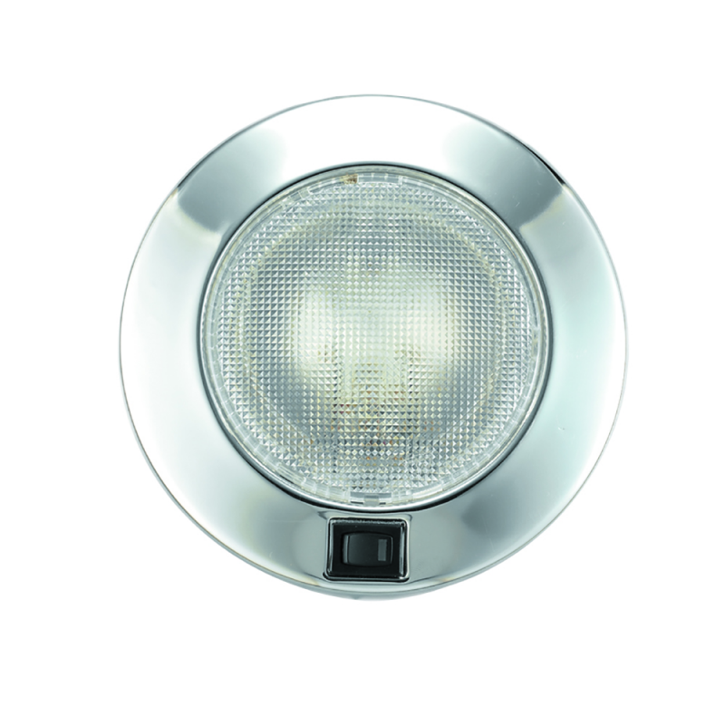 Courtesy light made of stainless steel AISI 316, Ø external mm. 153, cut-mm. 80, recessedmm. 25. The switch incorporates a LED to locate in the dark. Complete with bulb 10 W, 12V art. 4040962