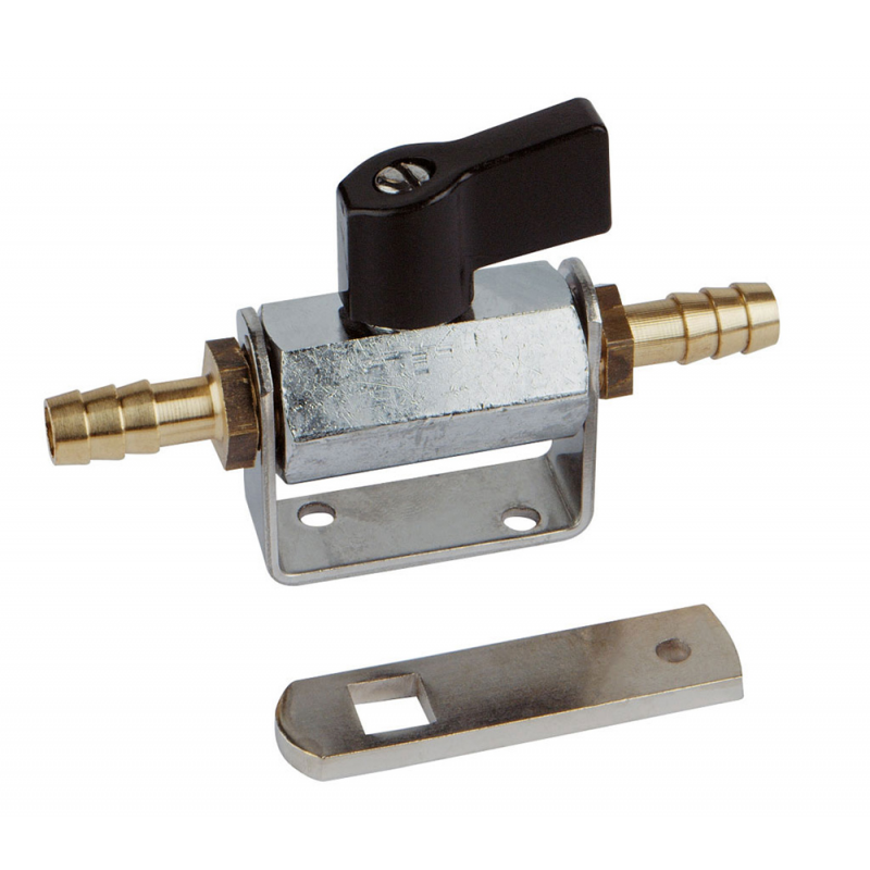 Remoted fuel tap made in chrome plated brass, R.I.Na. type. With a ball mechanism, internal change-over Ø 8 mm., 2 threaded holes of ¼”. Complete with bracket for wall mounting and two fuel line terminals of 1/4 x 10mm.With support you can fix on gasoline pipe, without bracket you canmount directly on gasoline tank.
