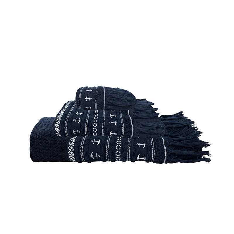 Towel set made of high quality 100% cotton terry 550gr.Velvety to the touch, with textures and embroidery, the face, shower and bidet towels of this elegant collection are ideal for adding a light nautical touch to the bathroom of any boat. Measures 33X50 – 50X100 – 70X140 cm.