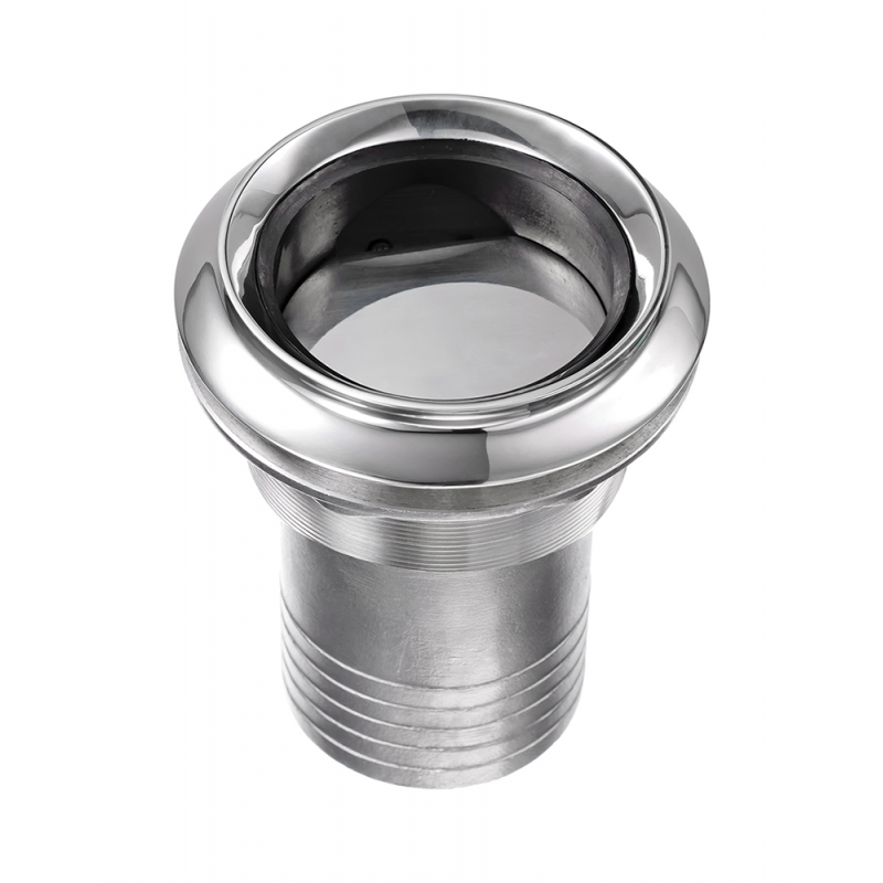 Engine exhaust pipein AISI 316 stainless steel, with a blade to prevent water from flowing back to the engine. External edge with groove to prevent engine exhaust water from dirtying the stern of the boat. Complete with counter flange for fixing.