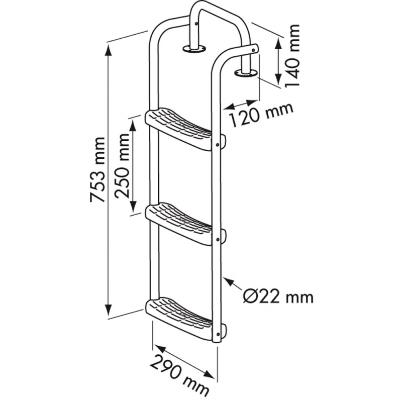 AISI 316 st. steel ladder and adjustable anti-slip steps in grey plastic.The exclusive steps ( 1 fixed step + 3 mobile ) allow the use of the sameladder for swimming and to get access to the boat, from the pontoon.With fixed stand-offs, in st. steel.