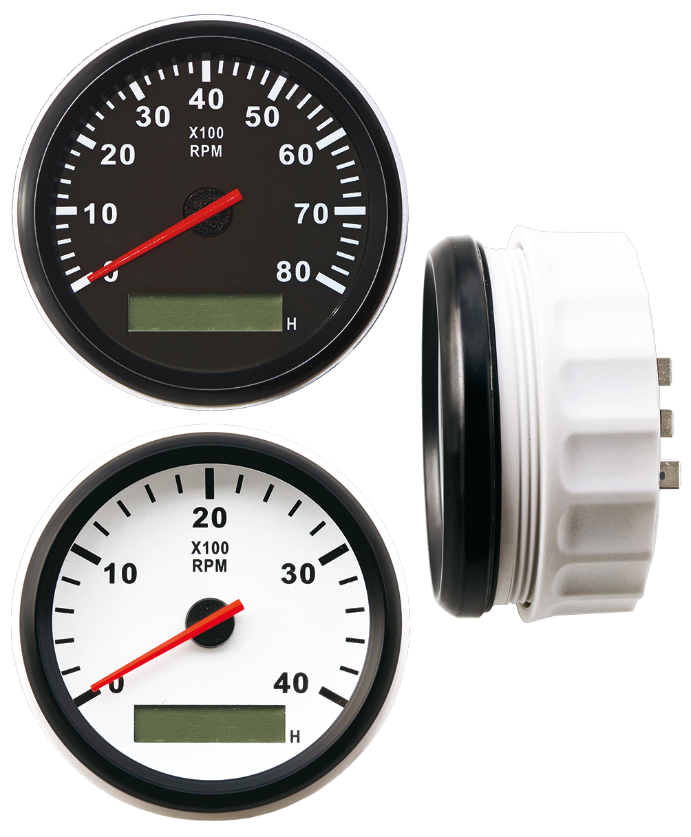 Tacômetros universais de montagem embutida com horímetros, equipados com luz noturna.