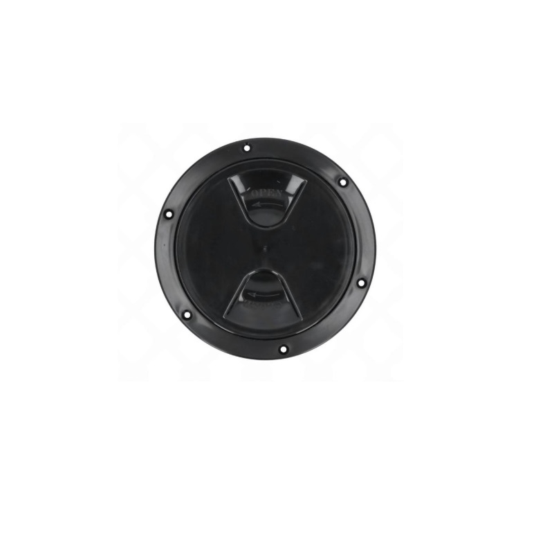Porta de inspeção circular preta, com diâmetro interno de 125 mm e externo de 170 mm. Fabricada em nylon de alta qualidade, esta porta é projetada para proporcionar acesso seguro e à prova d’água a compartimentos internos em embarcações, autocaravanas ou instalações técnicas.