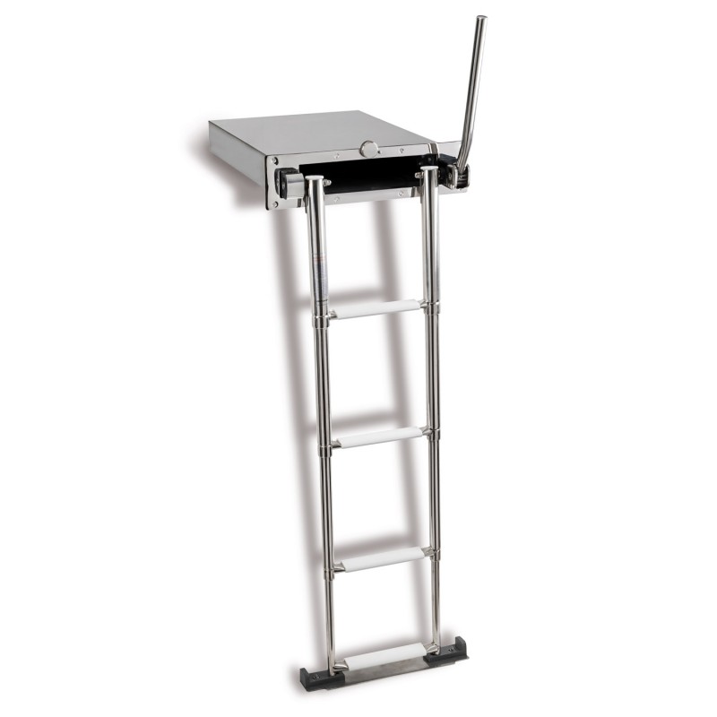 One 316 stainless steel telescopic retractable ladder with automatic handle system. The single handle facilitates access on board compared to two-handle versions. The brackets have increased thickness for better strength and the handle makes it easier to close from the stern platform. Installation of the box recessed into the thickness of the swim platform. Snap-on operation.