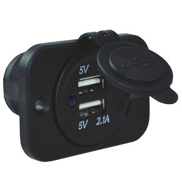 Tomada USB com 2 entradas (5V – 1A | 5V – 2A ) com alimentação de 12-24v.