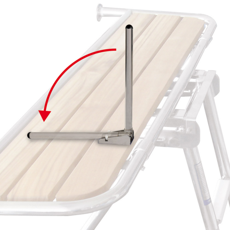 Universal foldable lift handle for stern platform in stainless steel AISI 316. Comfortable and easy ascend on platform, provided with snap lock both at rest and in use position. Possibility of fixing to LH or to RH of the ladder.
