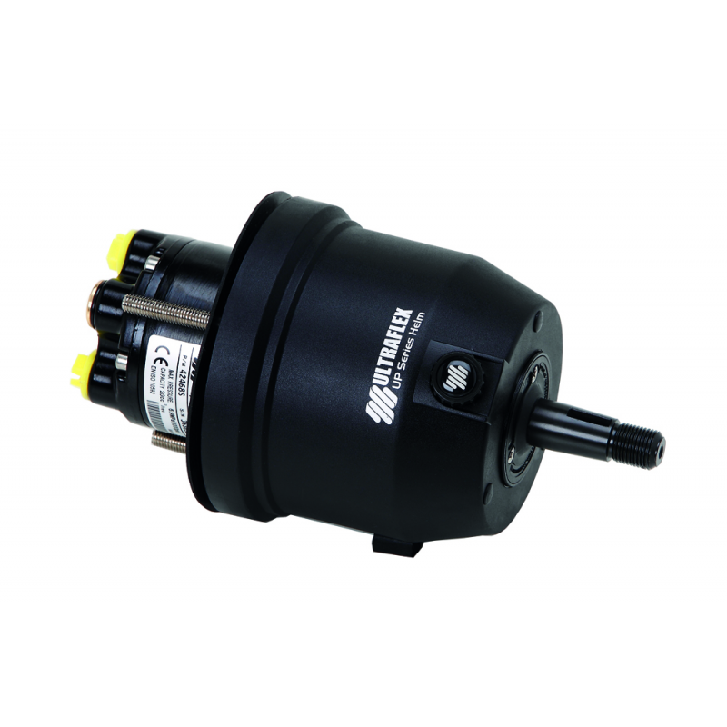 Front mounting. Lock valve to avoid rudder feedback to the helm. Relief valve for over-pressure protection. 3/ 4” tapered shaft. Composite material tank, corrosion resistant. Complete with elbow fittings. Possible flush mounting with flange X64. Weight 3,6 kg.