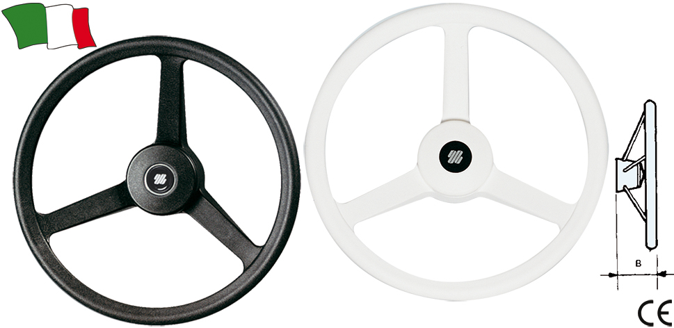 Volante de três raios à prova de choque completo com cubo termoplástico com punho rígido.