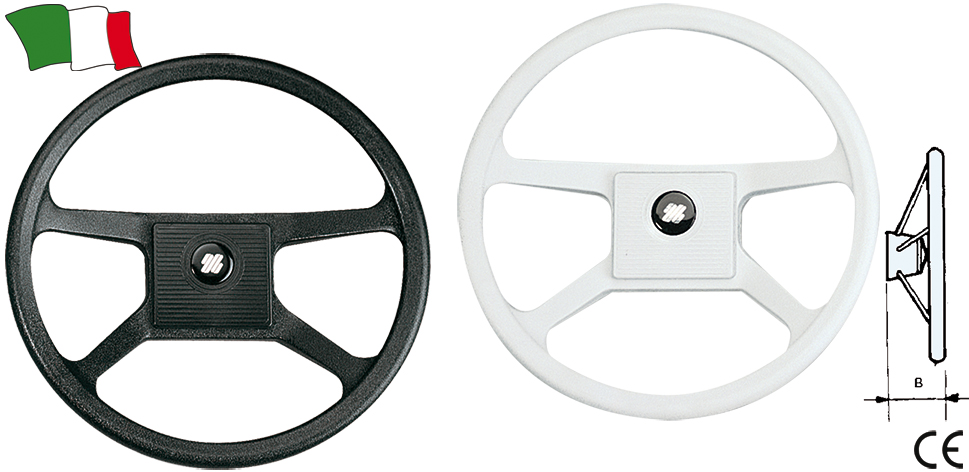 Volante de quatro raios à prova de choque, com cubo termoplástico e empunhadura rígida. Recomendado para barcos pequenos e botes.